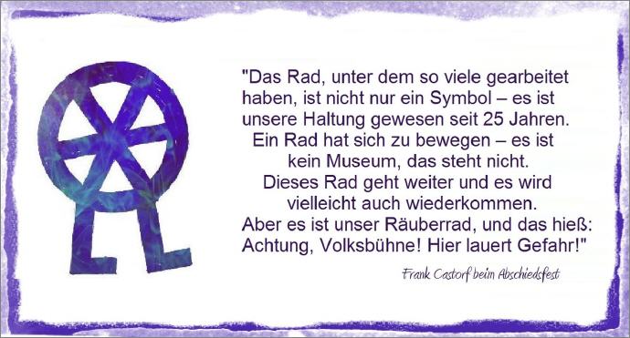 11 Monate später gab es die DDR nicht mehr. 11 Tage vor ihrem Ende tobten Schillers Räuber über die Volksbühne. Regie: Frank Castorf. Bühnenbildner Bert Neumann hatte das laufende Rad – einst Geheimzeichen der Räuber und Wegelagerer - für die Castorf'sche „Räuber“-Inszenierung entworfen. Das Rad galt als Logo des neuen Rebellentums an der Volksbühne. 1992 wurde Frank Castorf zum Intendanten berufen. „In zwei Jahren ist die Volksbühne entweder tot oder berühmt“ lautete die Prophezeiung für seine Amtszeit. Die Volksbühne musste sich neu erfinden und kämpfte ums Überleben.