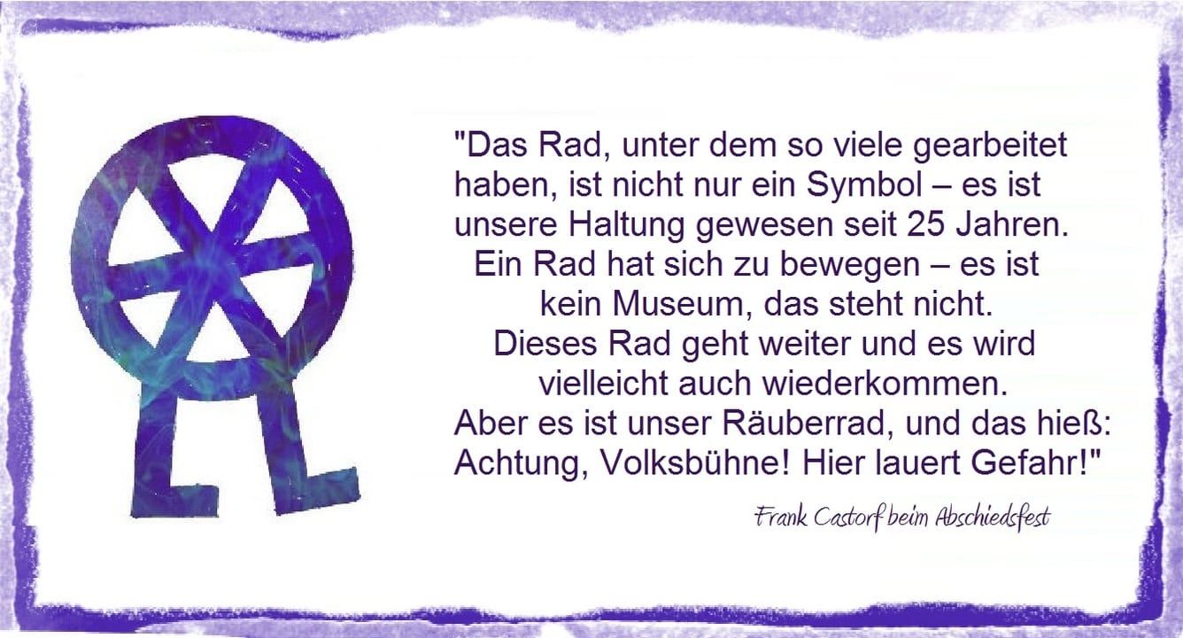 11 Monate später gab es die DDR nicht mehr. 11 Tage vor ihrem Ende tobten Schillers Räuber über die Volksbühne. Regie: Frank Castorf. Bühnenbildner Bert Neumann hatte das laufende Rad – einst Geheimzeichen der Räuber und Wegelagerer - für die Castorf'sche „Räuber“-Inszenierung entworfen. Das Rad galt als Logo des neuen Rebellentums an der Volksbühne. 1992 wurde Frank Castorf zum Intendanten berufen. „In zwei Jahren ist die Volksbühne entweder tot oder berühmt“ lautete die Prophezeiung für seine Amtszeit. Die Volksbühne musste sich neu erfinden und kämpfte ums Überleben.