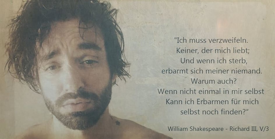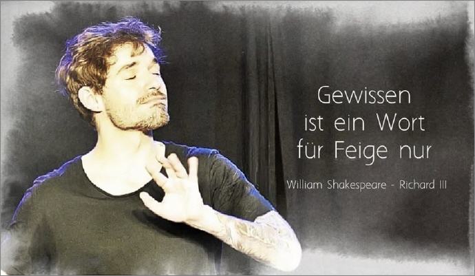 "Auf meinem bangen Leib steht Angst in kalten Tropfen. Was fürchte ich? Mich selbst? Sonst ist hier niemand. Richard liebt Richard, das heißt, ich bin ich. Ist hier ein Mörder? Nein. – Ja, ich bin hier. Dann Flieh! – Was, vor dir selbst? Mit Grund: warum? Damit ich selbst mich an mir selbst nicht räche. Ach, doch ich liebe mich! Warum? Für etwas Gutes,